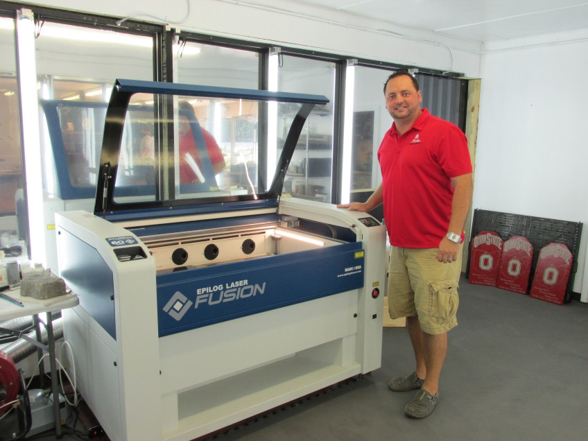 Published September 29, 2015 at 4608 × 3456 in Small Business Spotlight: Modern Technology To Heirloom Gifts Owner Ben Barker shows off one of the printing machines he uses at Buckeye Designs and Engraving